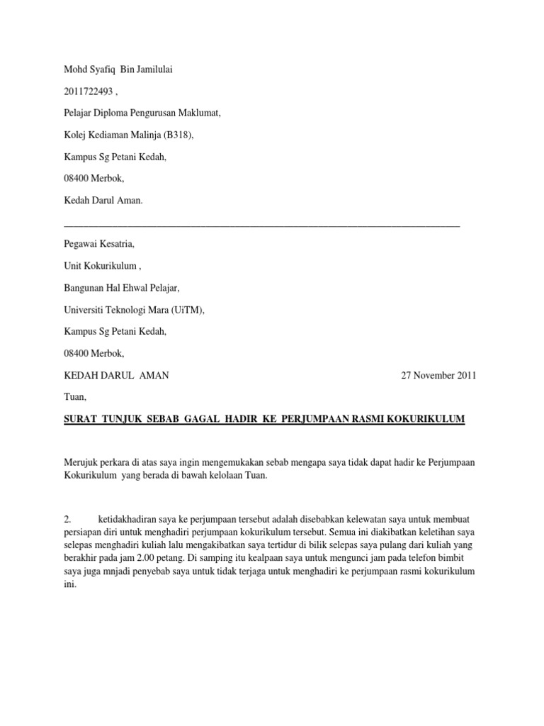 Universiti teknologi mara uitm kampus sg petani kedah 08400 merbok kedah darul aman tuan surat. Web Surat tidak hadir ke sekolah atau cuti sakitramai ibu bapa dan pelajar yang banyak membuat carian tentang contoh surat rasmi tidak hadir ke sekolah. Web Contoh surat ketidakhadiran ke kelas kuliah.